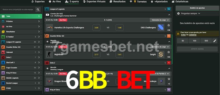 A 6BB Bet oferece uma seleção abrangente de opções de apostas em e-sports. Com uma ampla variedade de jogos para escolher, incluindo League of Legends, Dota 2 e CS:GO, há algo para todos os fãs de esportes eletrônicos. Além das apostas pré-jogo, a 6BB Bet também oferece opções de apostas ao vivo para muitos de seus eventos de e-sports. Portanto, seja você um novato em apostas em e-sports ou um profissional experiente, a 6BB Bet bet tem tudo o que você precisa para começar.